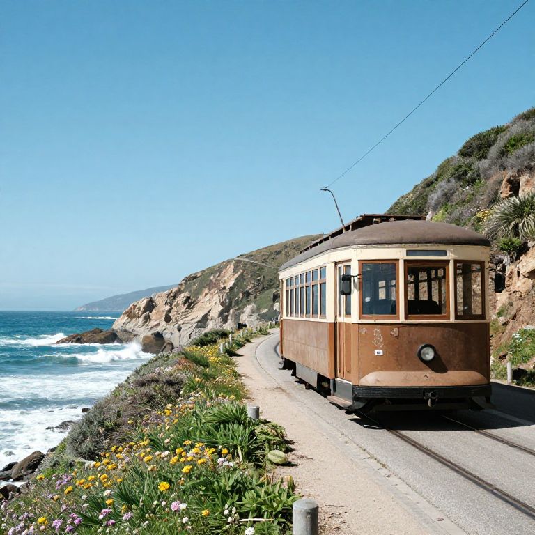Tramway traveling along a coastal road, ocean waves crashing nearby, cliffs covered in wildflowers, bright sunny day with clear blue sky, vintage tram design with worn textures, relaxed and scenic vibe, natural lighting, ultra detailed landscape