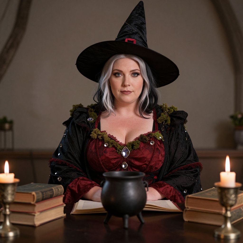 A digital CGI image of a fair-skinned woman with silver hair and blue eyes, dressed as a witch in a black, pointed hat and a deep red, lace-trimmed dress with black velvet sleeves. She has a serious expression and is seated at a wooden table with stacks of old books and lit candles on either side. A black cauldron is centered on the table in front of her. The background is dimly lit and features a curved, arched wall, adding a mystical atmosphere. The image has a realistic yet slightly stylized, fantasy art aesthetic.