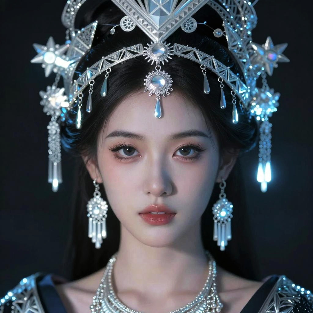 This captivating image features a regal woman adorned in intricate jewelry, embodying a mystical aura with vibrant, colorful elements surrounding her. The artistic style blends fantasy with elegance, showcasing a rich combination of blues and golds that enhance her royal presence.