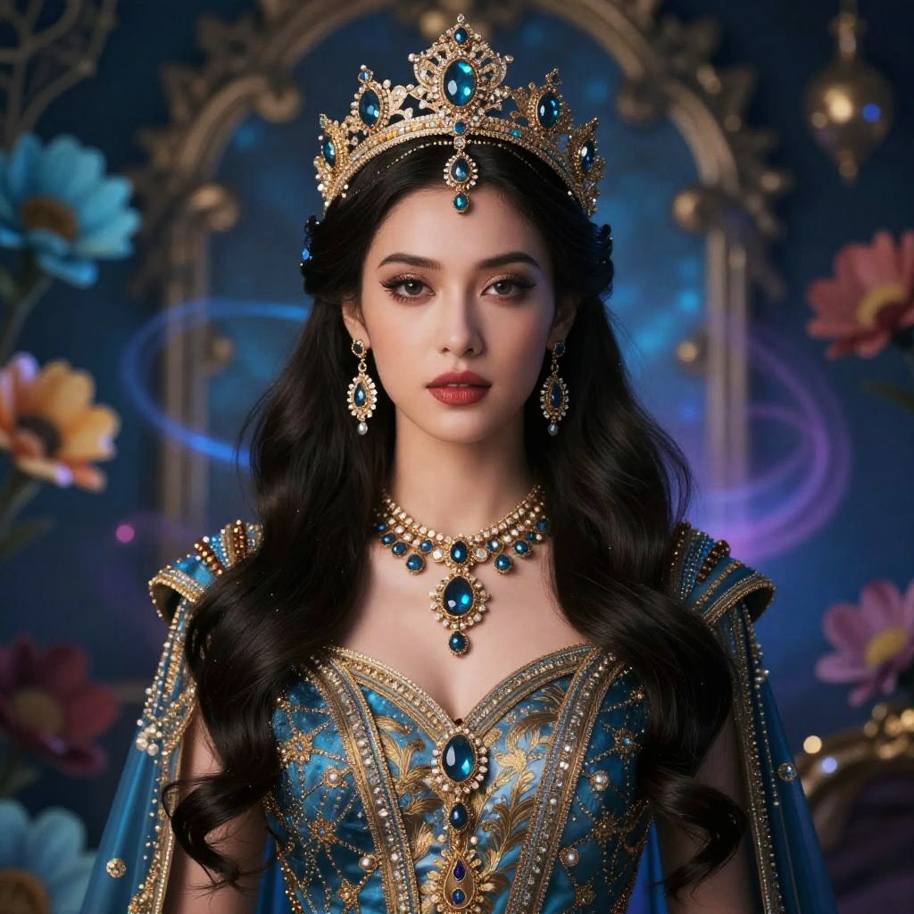 Portrait of a regal woman with long dark hair wearing an ornate blue and gold dress, matching jeweled crown, earrings, and necklace featuring large blue gemstones. The background is decorated with colorful flowers and mystical glowing elements, enhancing the elegant and fantasy-inspired royal atmosphere.