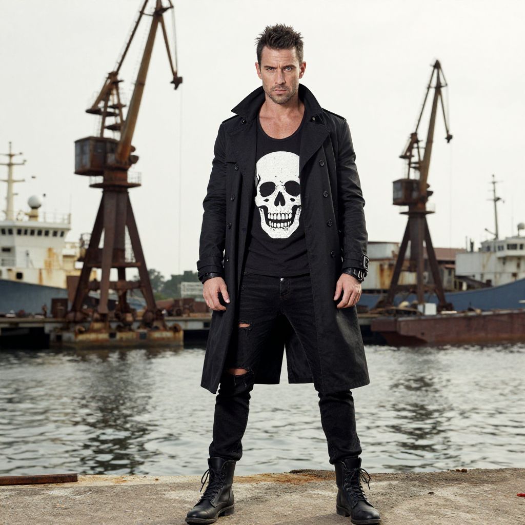 Photograph of a muscular, white man with short, spiked black hair, standing confidently on a dock. He wears a black, long trench coat over a black t-shirt with a white skull graphic, and ripped black jeans with black boots. His intense gaze is directed at the camera. In the background, there are two large, rusted cranes and industrial ships on a calm, reflective body of water. The sky is overcast, adding a stark contrast to the dark clothing. The overall style is edgy and gothic, with a gritty, urban industrial setting.