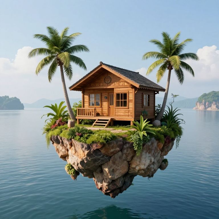 A quaint wooden cabin perched atop a serene, floating island defies gravity as it hovers gracefully above a tranquil sea, surrounded by lush palm trees and distant rock formations, creating a surreal oasis in the sky.