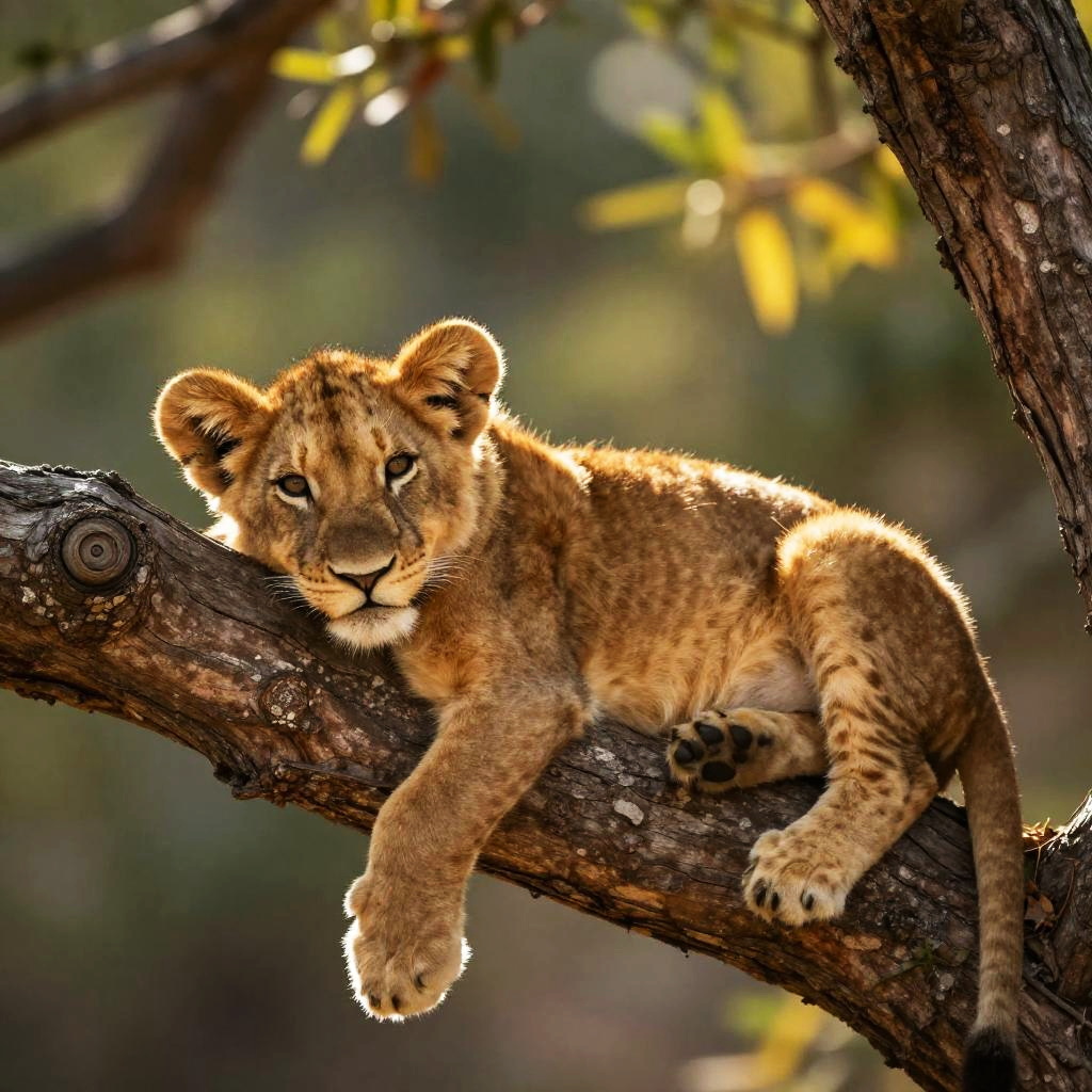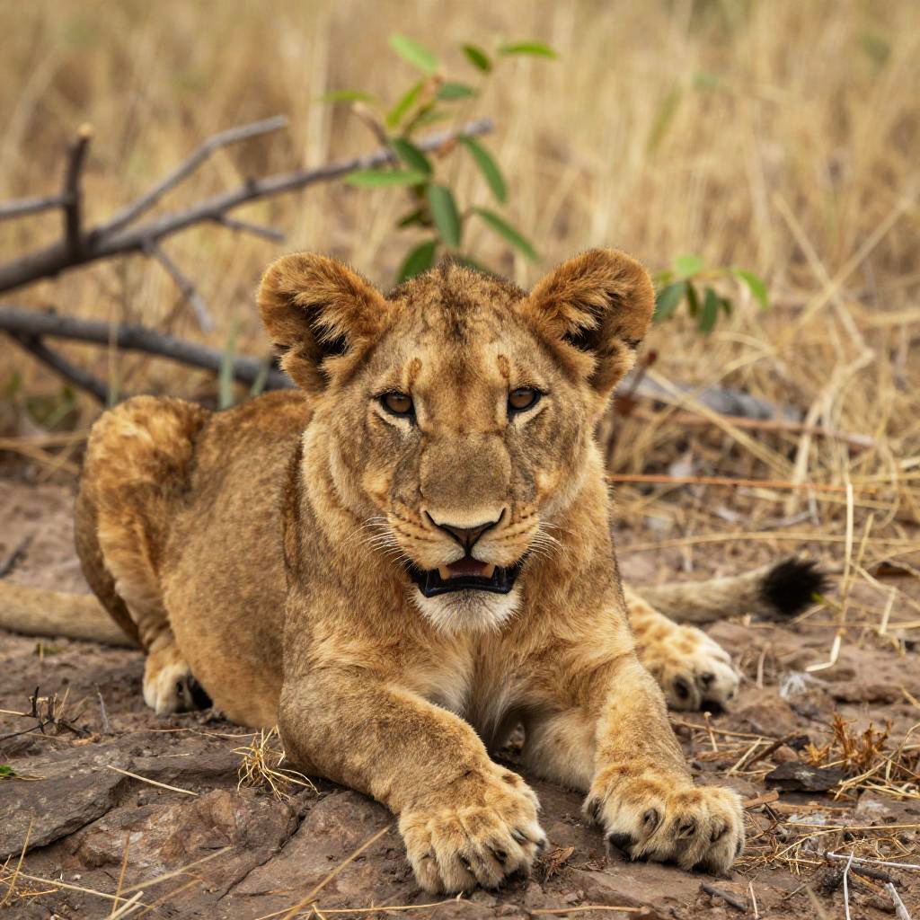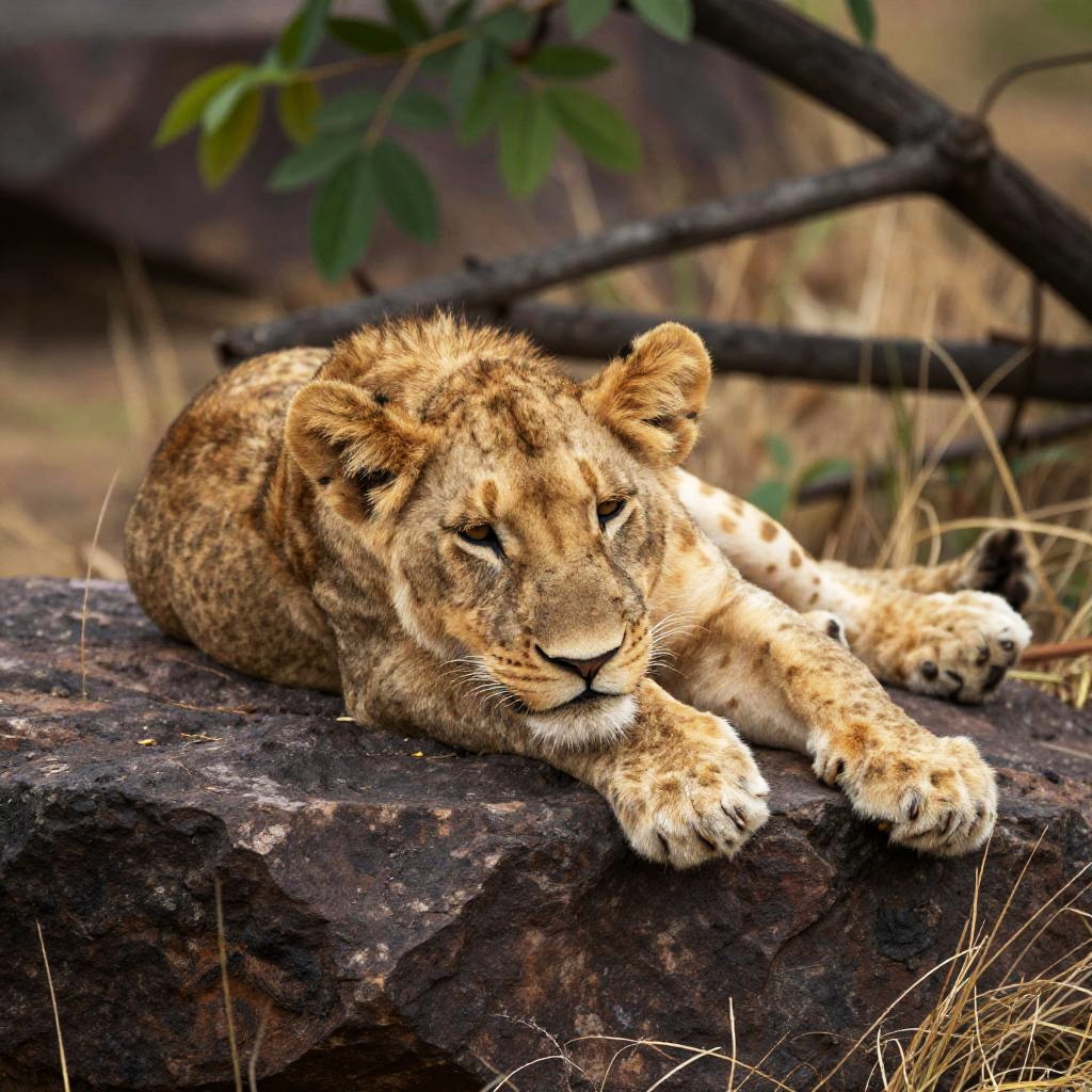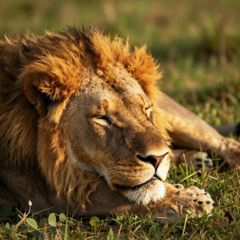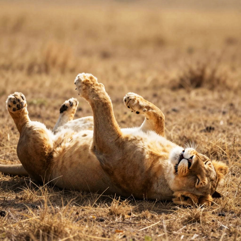 Photograph of a lazy lioness lying on her back in the sun-drenched savannah. She's got a relaxed expression with her eyes closed, her paws playfully in the air. Her tawny fur contrasts with the dry, brown grass beneath her. The background is softly blurred, emphasizing her relaxed state. There's a watermark in the bottom right corner.