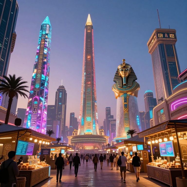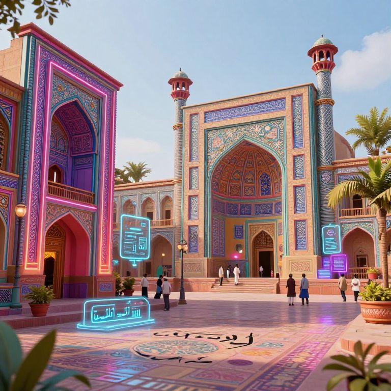 Pakistani AI prompt: A futuristic digital art scene in Pakistan, showcasing AI-generated visuals blending traditional patterns with modern technology, vibrant colors, and neon-lit streets in Lahore, with Urdu script and AI interfaces embedded in the architecture.
