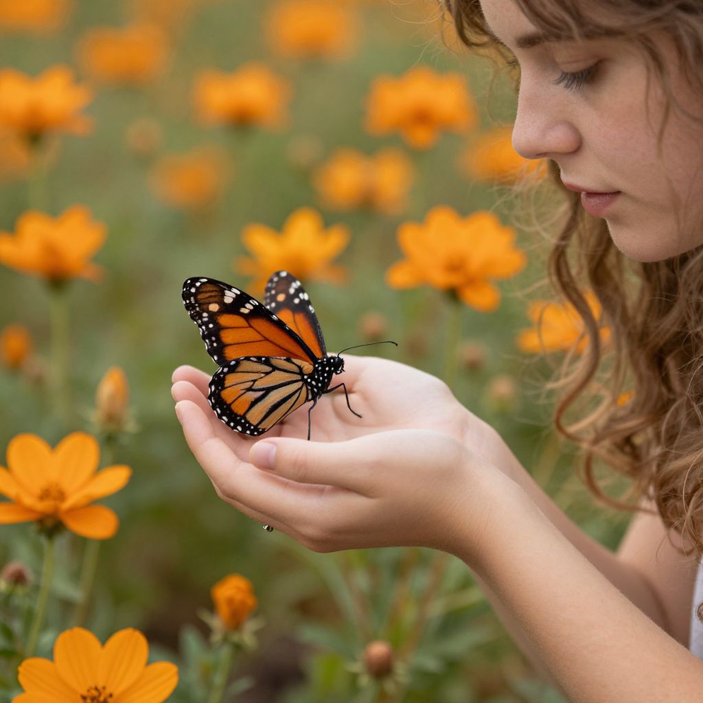 Photograph of a young woman with wavy brown hair, fair skin, and closed eyes, gently cupping an orange and black monarch butterfly with white spots on its wings. She is surrounded by a blurred background of bright orange flowers, creating a soft, natural setting. The butterfly is perched delicately on her slightly tilted hand, its wings partially open. The image has a warm, serene atmosphere, highlighting the delicate interaction between the woman and the butterfly. The focus is on the butterfly and the woman's hand, with the flowers providing a vibrant, bokeh effect.