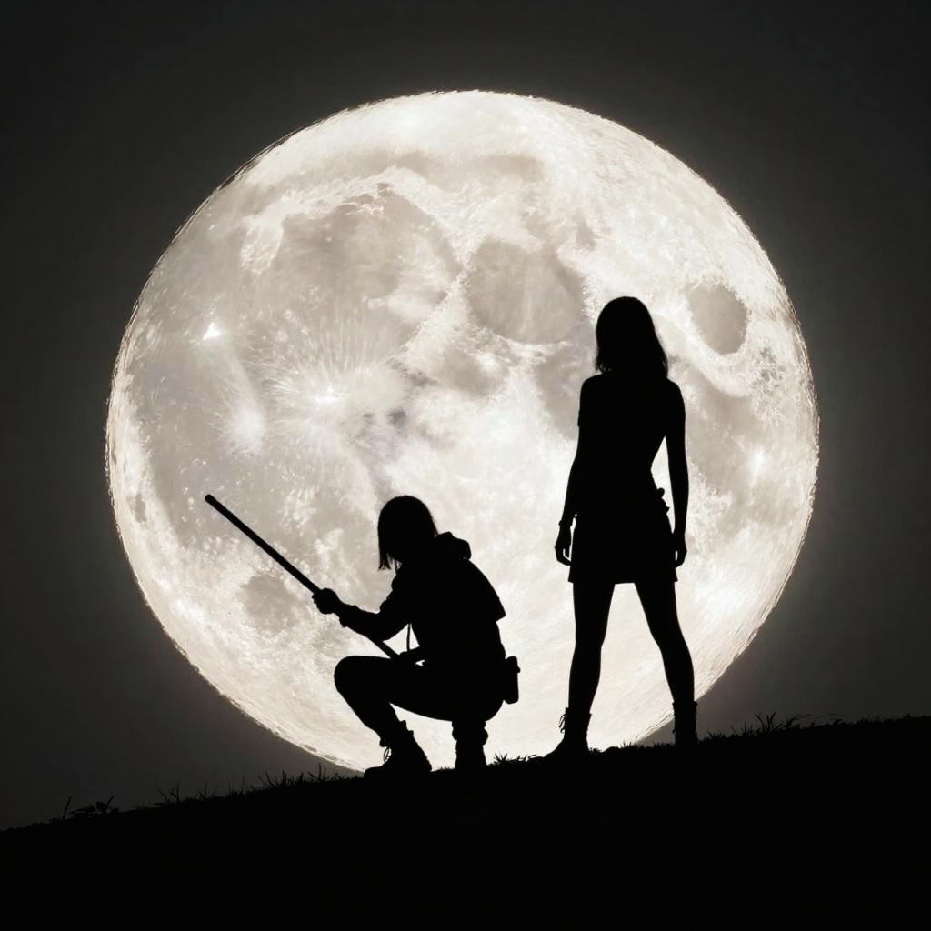 Silhouetted against a massive, glowing full moon, two figures stand on a dark hill. The figure on the left is crouched, holding a long weapon, while the one on the right stands upright. The moon's intense white light contrasts sharply with the dark sky and hill, creating a dramatic, almost cinematic nighttime scene. The silhouettes are bold and mysterious.