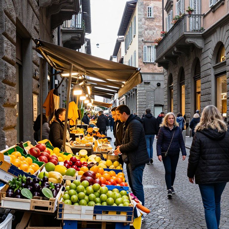 Torino markets bustling with vendors and shoppers, colorful fruits and vegetables on display, traditional Italian street food stalls, lively atmosphere with cheerful people, narrow alleys with historic stone buildings, vibrant and immersive
