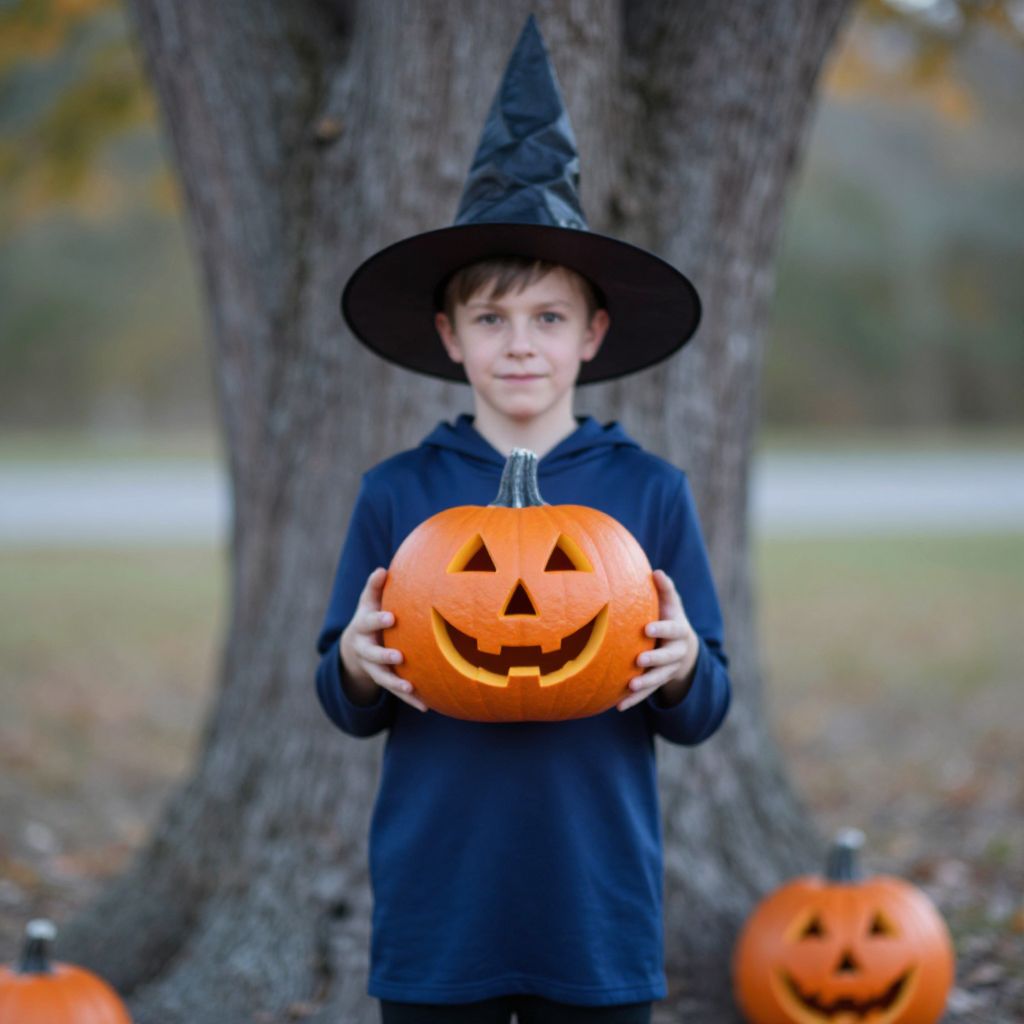 Young boy in black witch hat, holding carved orange pumpkin with a jack-o'-lantern face, standing before a large tree in a blurry autumn park