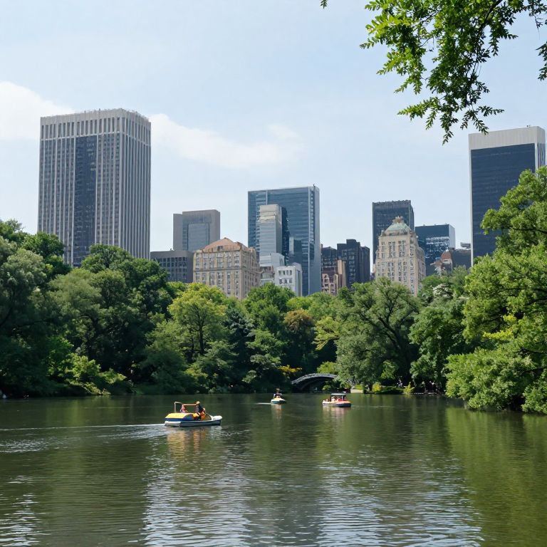 Lush green trees frame a serene lake in Central Park, New York, where paddleboats glide gracefully beneath the towering skyscrapers of Manhattan's skyline.