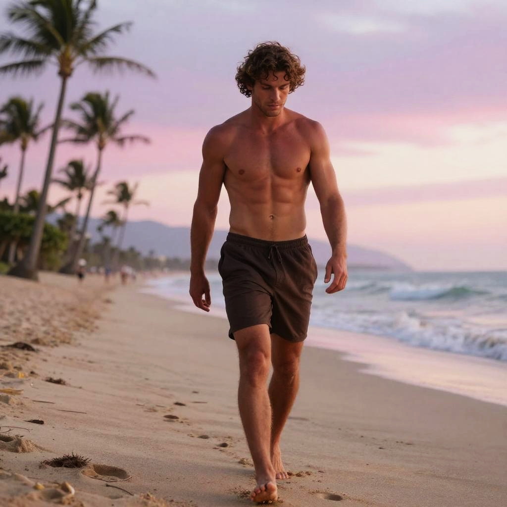 Matthew McConaughey muscle beach scene, sun-kissed skin, waves crashing, defined abs and biceps, casual confident stance, vibrant colors, photorealistic style