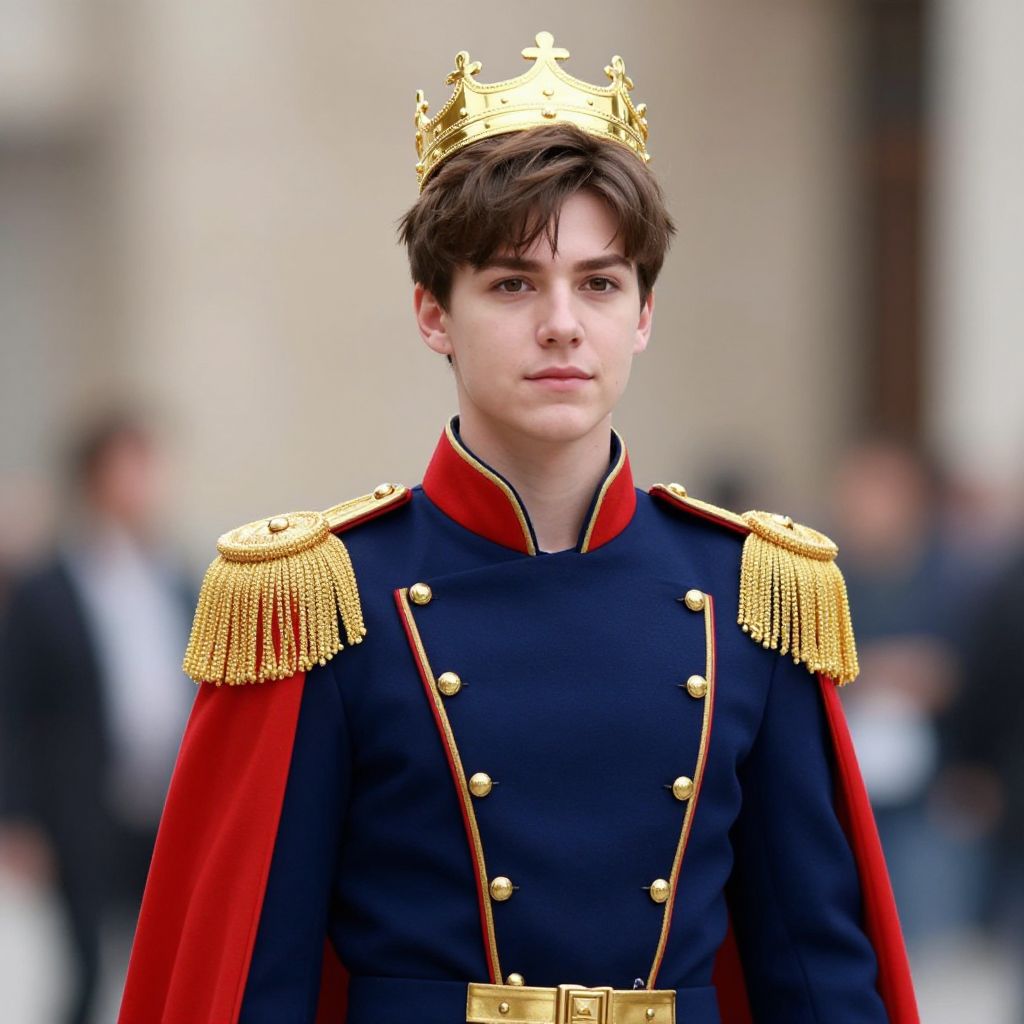Photograph of a young white male with fair skin, short brown hair, and a slender build, wearing a regal military uniform. He has a gold crown with intricate designs on his head, and his uniform is navy blue with red accents and gold epaulettes adorned with long, dangling tassels. He wears a red cape over his shoulders, fastened at the front with a gold belt. His expression is neutral, and he stands in a blurred outdoor setting with indistinct people in the background. The lighting is natural, highlighting the details of his uniform.