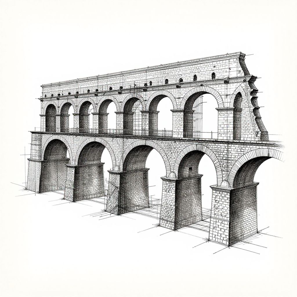 Wool Ultra detailed academia , blueprints construction elevation, etching of ancient bridge arches, roman on white vintage background,