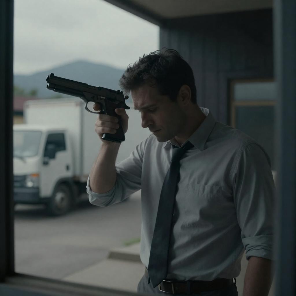 Photograph of a man in a white shirt and glasses, pointing a black handgun to the right. He stands in a dimly lit, red-walled room with tiled floors. In the background, a woman in a floral dress stands near a brightly lit window. A camera and red counter are on the left.