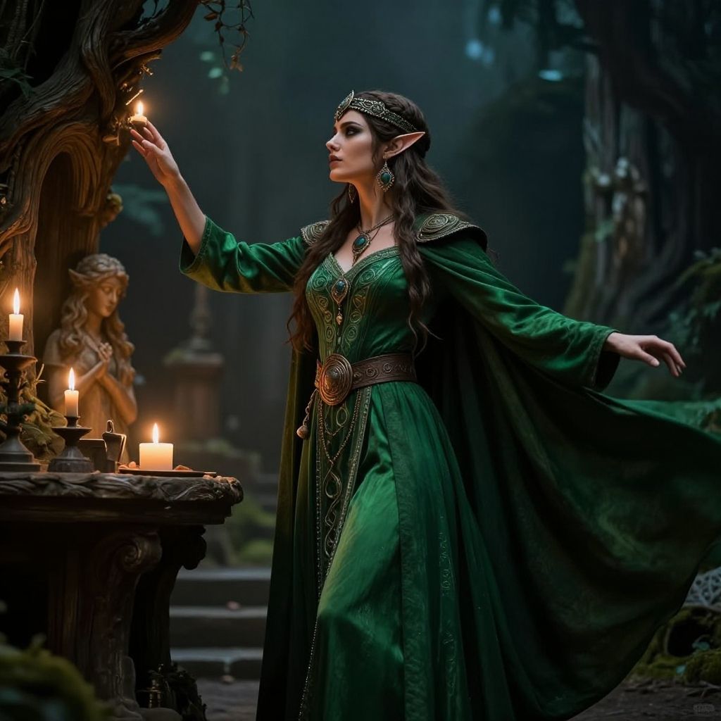 Photorealistic digital fantasy art: Elf woman in green gown with intricate embroidery, crown, and pointed ears, lighting candles in mystical forest.