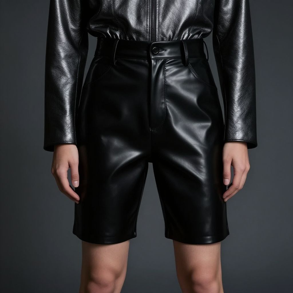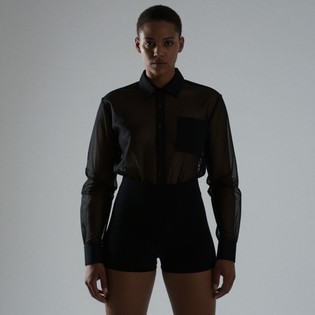 Photograph of a serious-faced, dark-skinned woman with short, natural hair, standing against a plain, light gray background. She wears a black, semi-sheer, long-sleeve button-up shirt that is slightly transparent, revealing a hint of a black undergarment. Her black shorts are high-waisted and form-fitting, accentuating her slender, athletic build. The lighting is minimal, creating strong shadows and highlighting the contours of her face and body. The overall composition is simple, focusing on her confident, poised stance and the contrast between the dark clothing and light background.