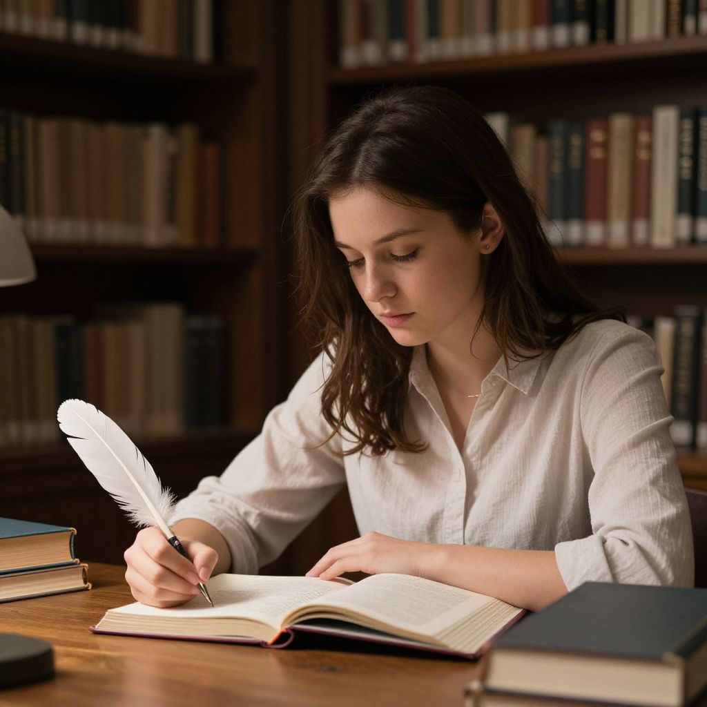 Focused young woman sits at a wooden desk in a dimly lit library, surrounded by shelves of books, as she pens notes with a delicate white feather quill while studying an open book.