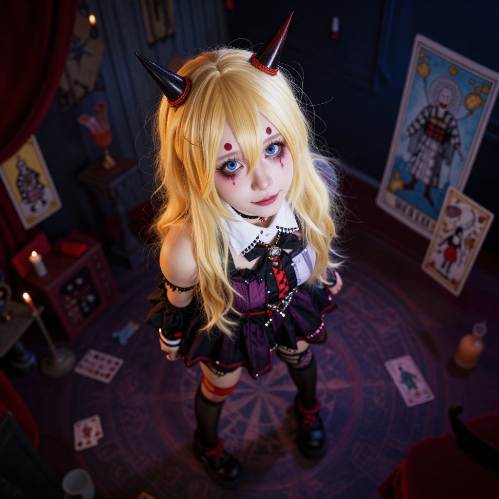 Isometric, eye-level, full-body-shot, (clowncore:1.3) (((young)) 21yo female, cosplayer, egirl, ideal-eyes, long blonde hair, cute-overload, beauty-overload, (adorable:1.2), skin details, hypermaximalist, Hyperdetailed Photography, breath-taking-beauty, clown-makeup, goth, punk, creepy carnival settings, nightfall, tarot-style, bizarre scenery, realistic, (dark:1.4) backlit, cinematic
