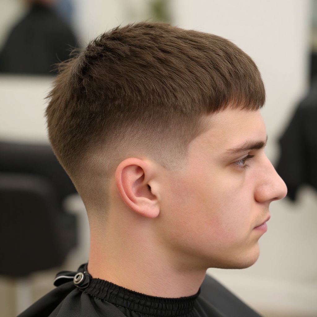 A modern Edgar Cut Fade on a European man, focusing on the precise fit and trendy hairstyle with natural texture, rendered in photorealistic detail.