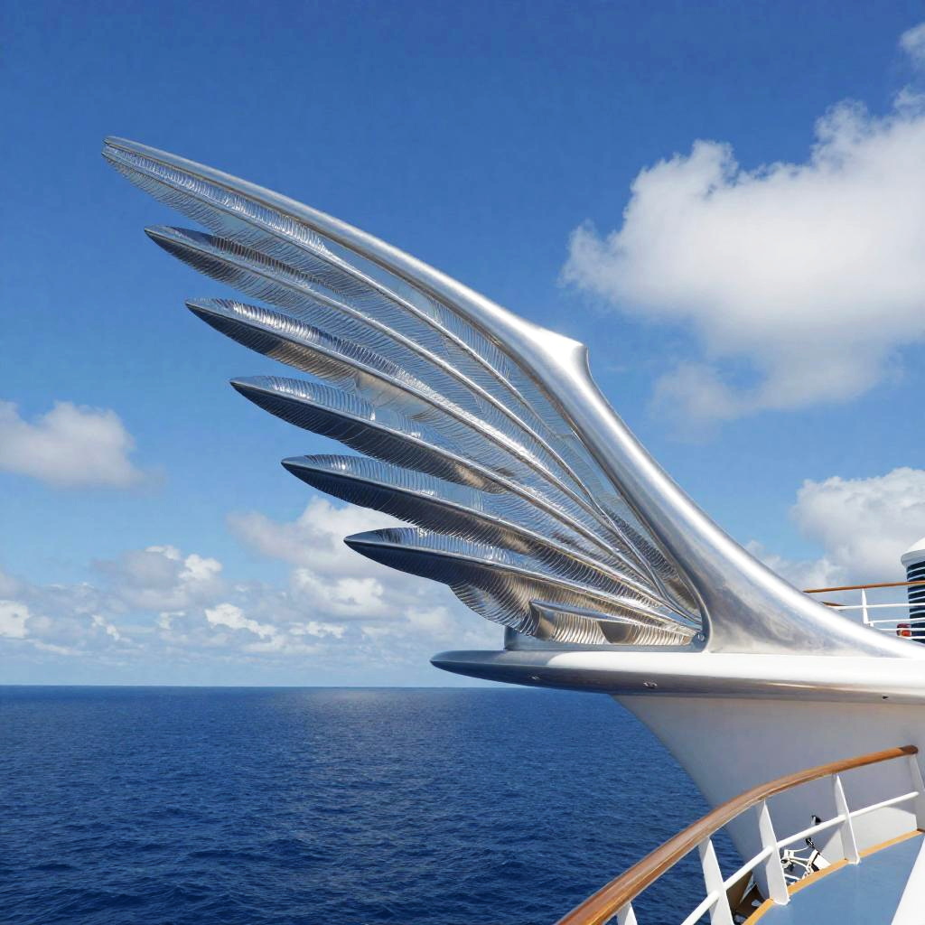 Cruise ship wings soaring above the ocean, futuristic design with sleek metallic feathers reflecting sunlight, vibrant blue sky with fluffy clouds, ultra-detailed digital art