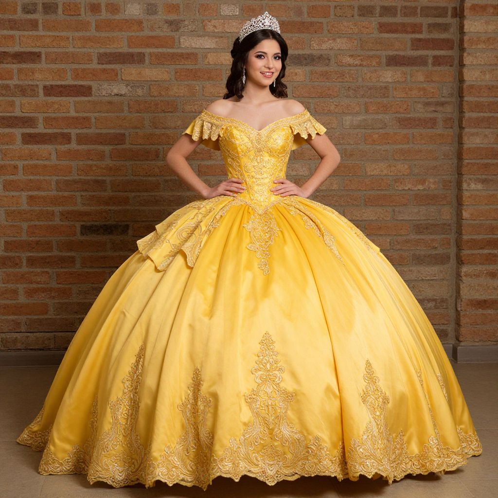 Elegant quinceañera ballgown 1431 featuring a vibrant yellow satin dress with intricate gold lace detailing, off-the-shoulder ruffled sleeves, and a sparkling tiara worn by a young woman against a rustic brick wall backdrop.