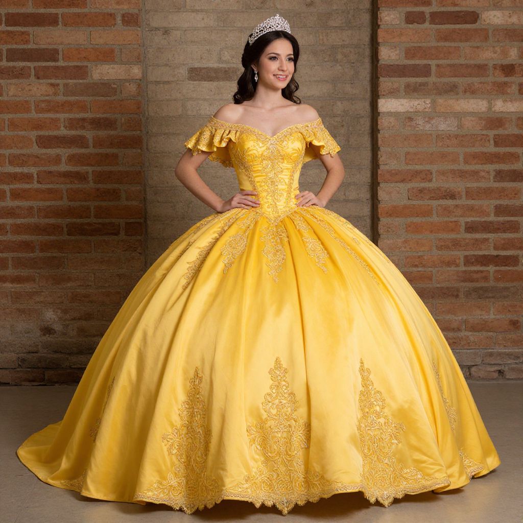 Photograph of a woman in a vibrant yellow, off-shoulder, lace-embellished ball gown with a full skirt, wearing a silver