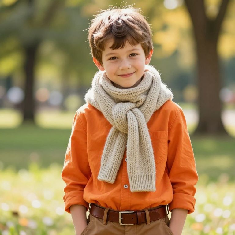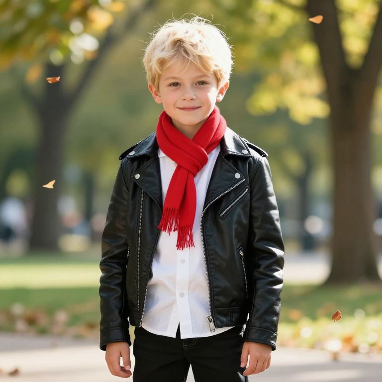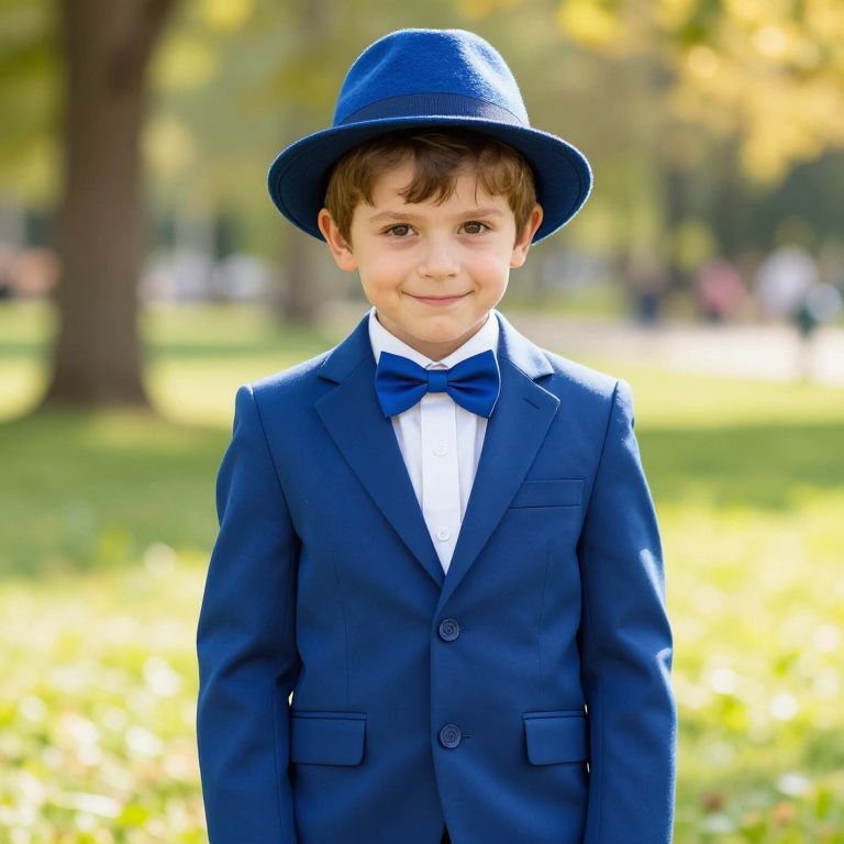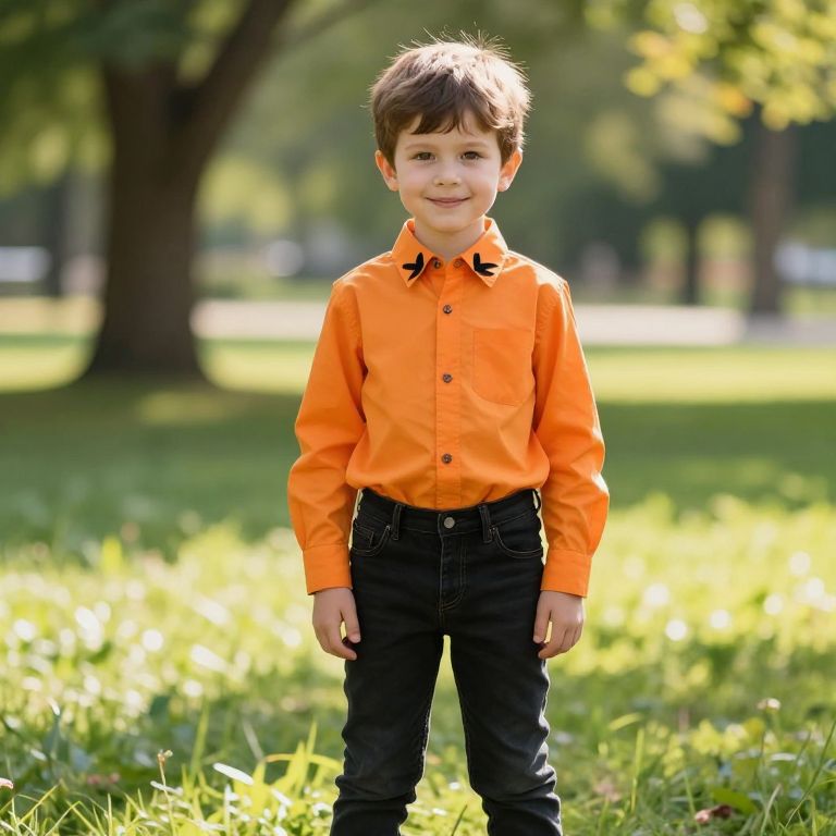 A young boy stands confidently in a sunny outdoor setting, wearing orange and black plaid pants, a black button-up shirt, a wide-brimmed hat tilted slightly to one side, and a black belt with a small buckle. He has short, messy hair, bright eyes, and a cheerful expression, adding to the lively and playful atmosphere. The background features a colorful neighborhood with trees, a few houses, and soft sunlight filtering through the leaves.