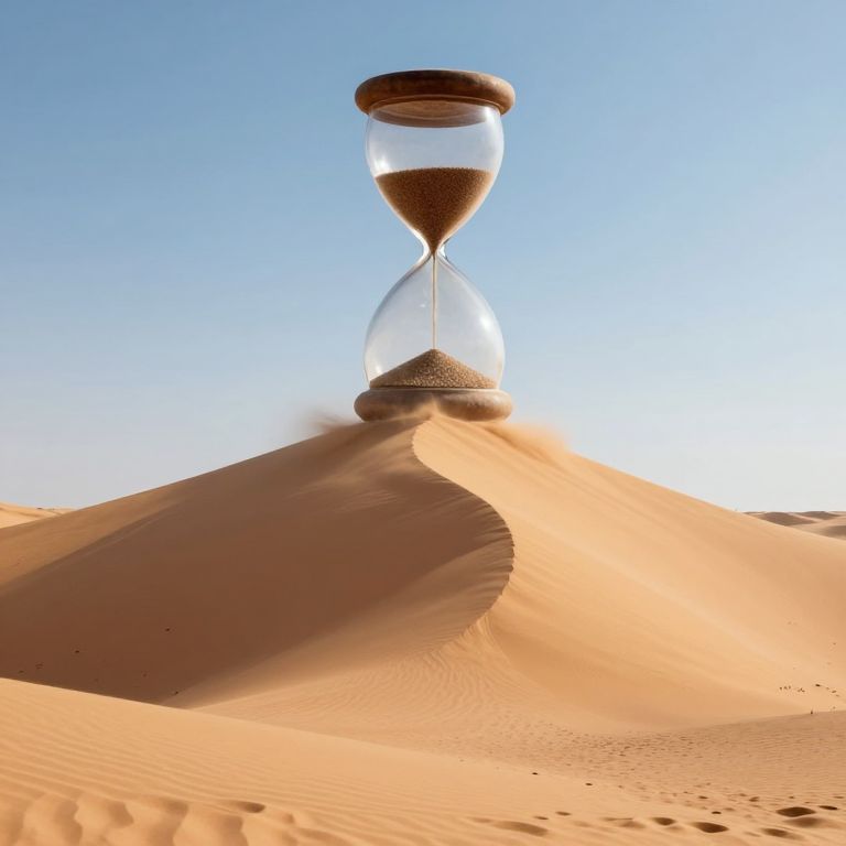 Photograph of a large, classic hourglass standing upright on a sunlit sand dune under a clear, bright blue sky. The hourglass is filled with brown sand, with the top bulb nearly empty and the bottom bulb nearly full. The sand dune has smooth, undulating ridges with fine, light orange sand. The hourglass casts a distinct shadow on the dune, adding depth to the image. The sunlight highlights the textures of the sand and the transparent glass, creating a serene, timeless desert scene.