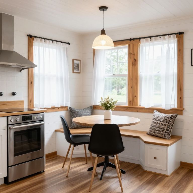 Cozy cabin interior showcases a harmonious blend of white walls, wooden accents, and rustic charm, featuring a compact kitchen with stainless steel appliances, a small dining nook with a round table and two black chairs, and a built-in bench with storage drawers and a decorative pillow, all illuminated by a pendant light and natural light streaming through windows draped with sheer curtains.