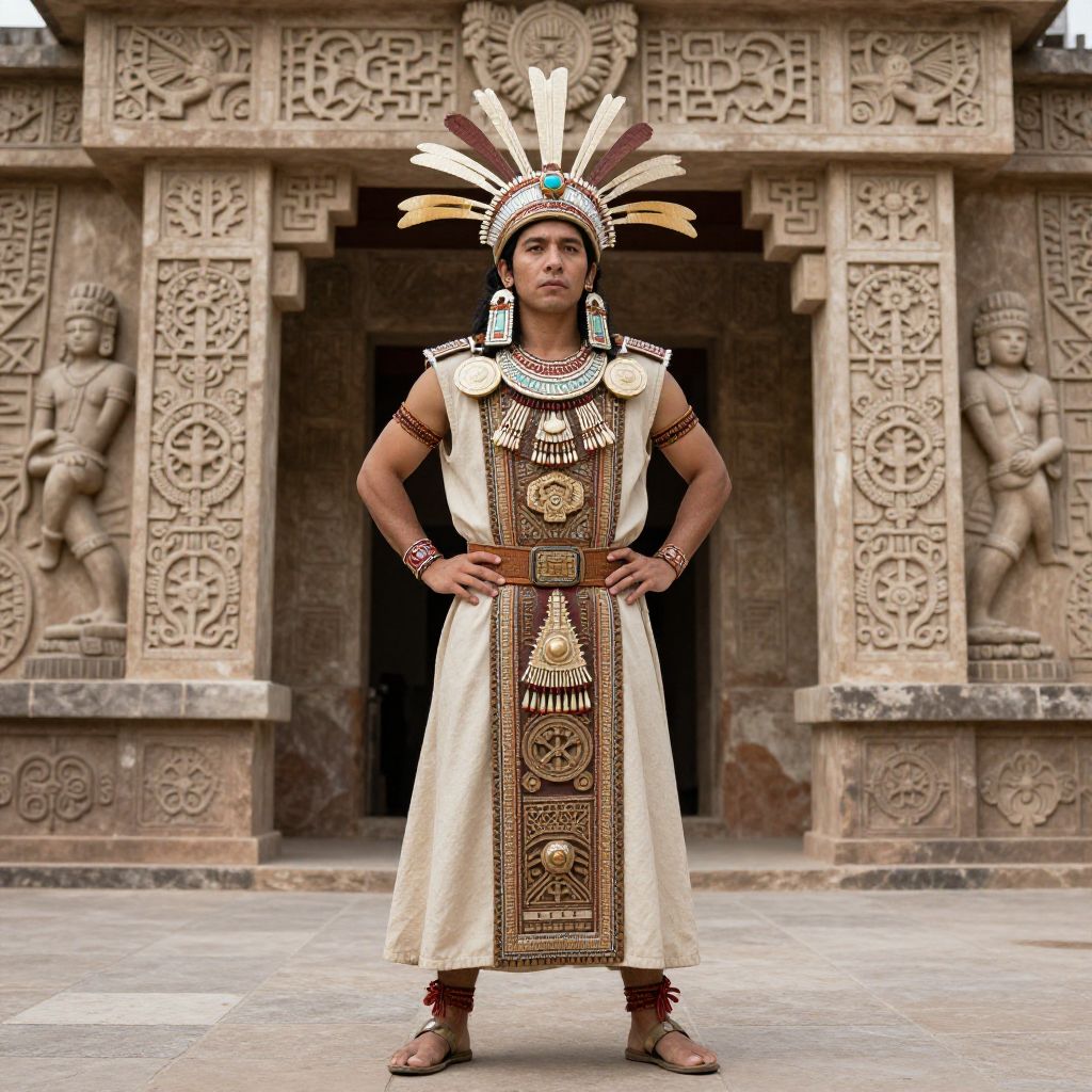 A man stands confidently in a traditional Aztec-inspired attire against the backdrop of an intricately carved structure that evokes a historical ambiance.