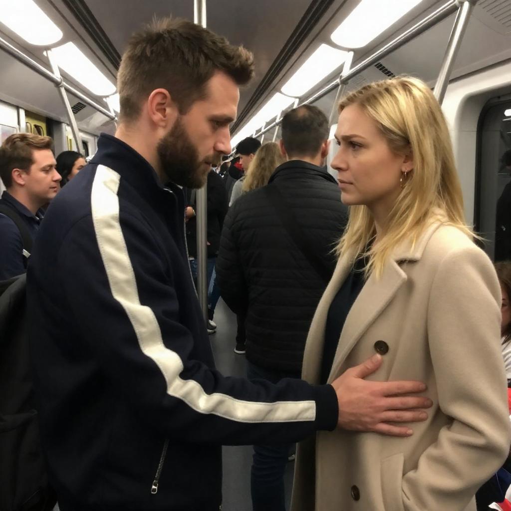 Photograph of a crowded subway car. A bearded man in a dark jacket with white stripes gently touches the arm of a blonde woman in a beige coat. Background includes diverse passengers, some standing, others seated, with bright overhead lights. The woman looks slightly concerned, while the man appears focused.