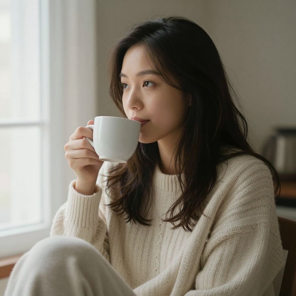 Photograph of an Asian woman with fair skin and straight, dark brown hair, sitting indoors by a sunlit window. She wears a cozy, cream-colored knit sweater and light beige pants. She holds a white ceramic mug close to her lips, with visible steam indicating a hot beverage. Her expression is calm and contemplative. The background is softly blurred, featuring a window with white frames and light curtains. The natural light from the window illuminates her face, adding a warm, gentle glow. The overall atmosphere is relaxed and serene.