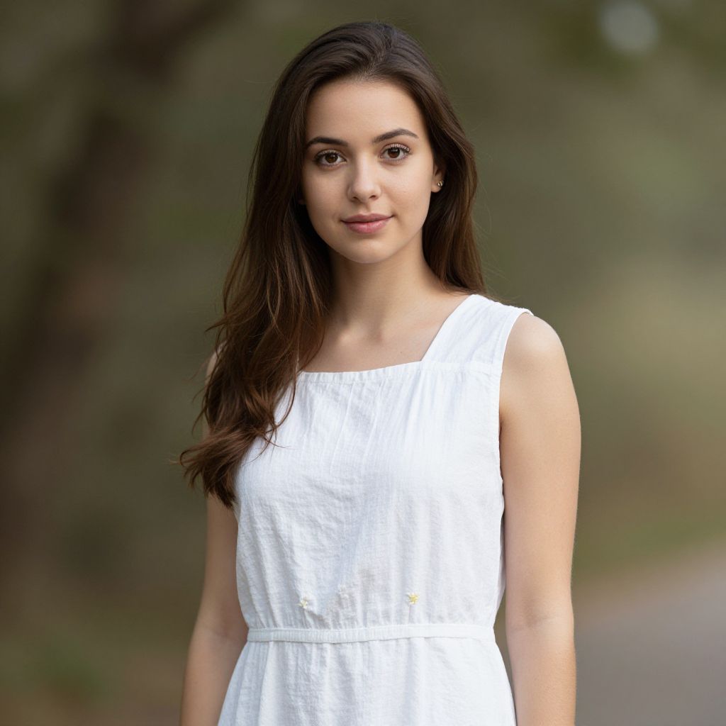 Photograph of a young woman with long, dark brown hair and fair skin, standing outdoors against a blurred green and brown natural background. She has dark brown eyes and is wearing a simple, sleeveless white dress with a square neckline. Her expression is calm and slightly smiling. The lighting is natural, highlighting her smooth complexion and the texture of her dress, which appears to be made of light, slightly textured fabric. She wears small, silver stud earrings. The overall composition is balanced and centered, focusing on her upper body.