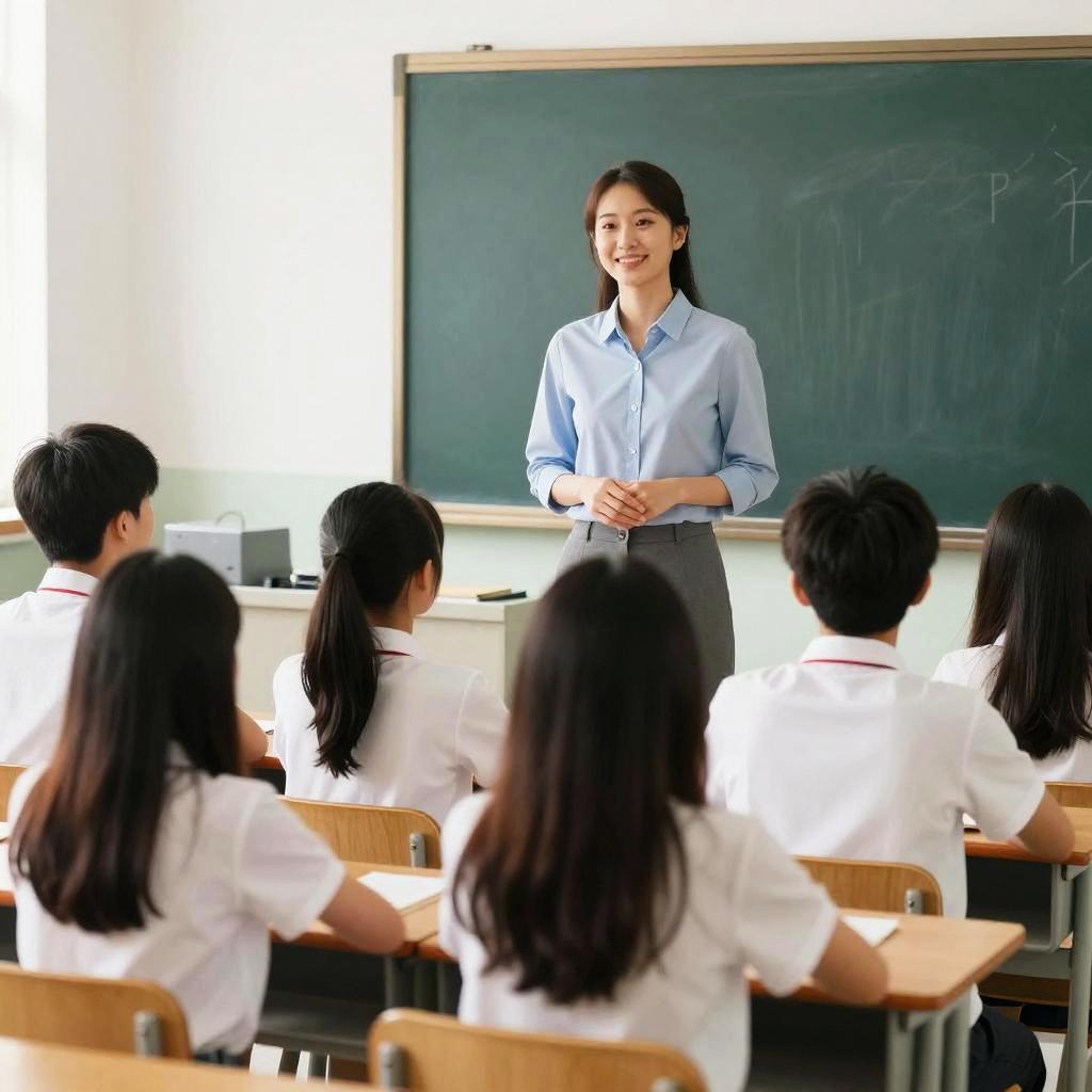 A teacher standing and smiling at a diverse group of attentive students in a classroom, bright natural light, soft lighting capturing a candid moment of teaching, realistic classroom setting with a chalkboard in the background