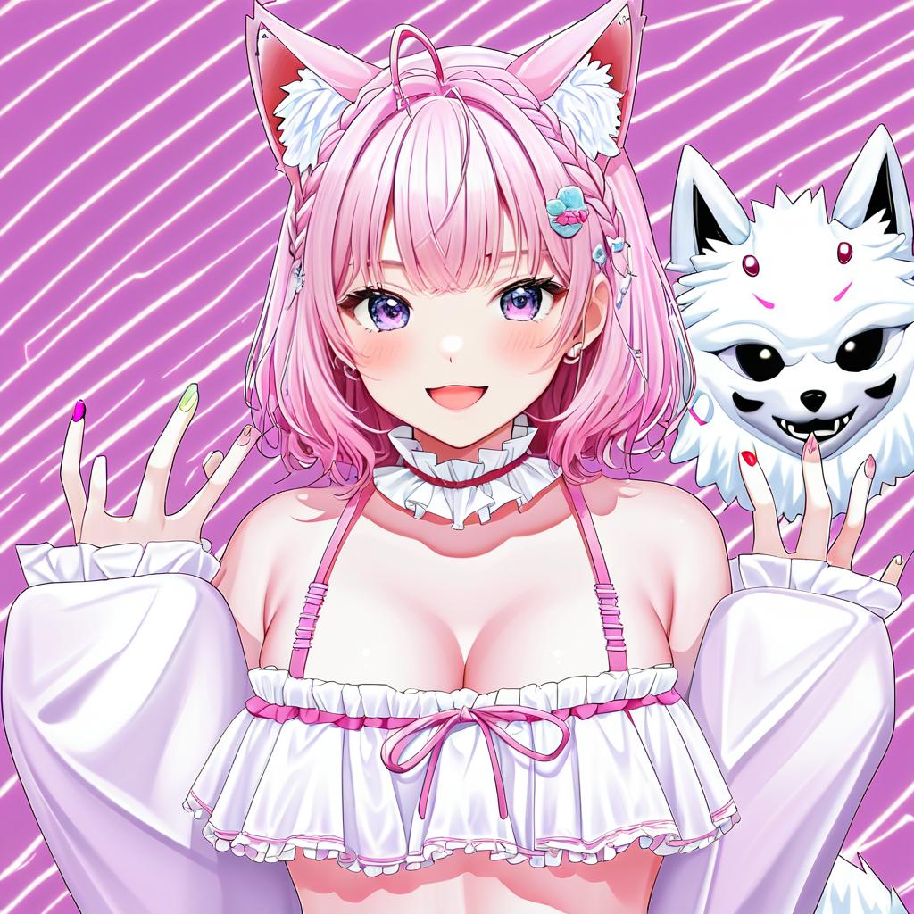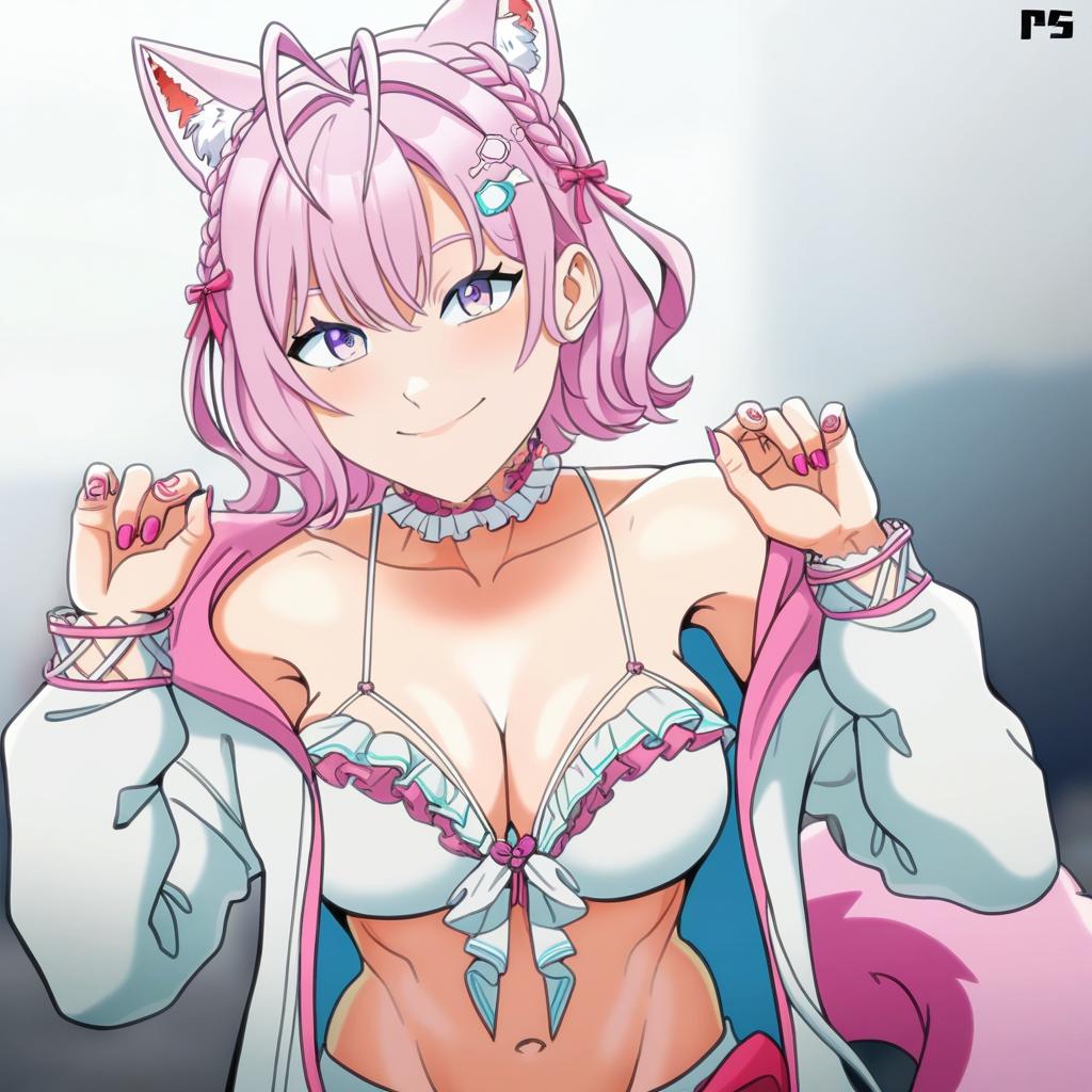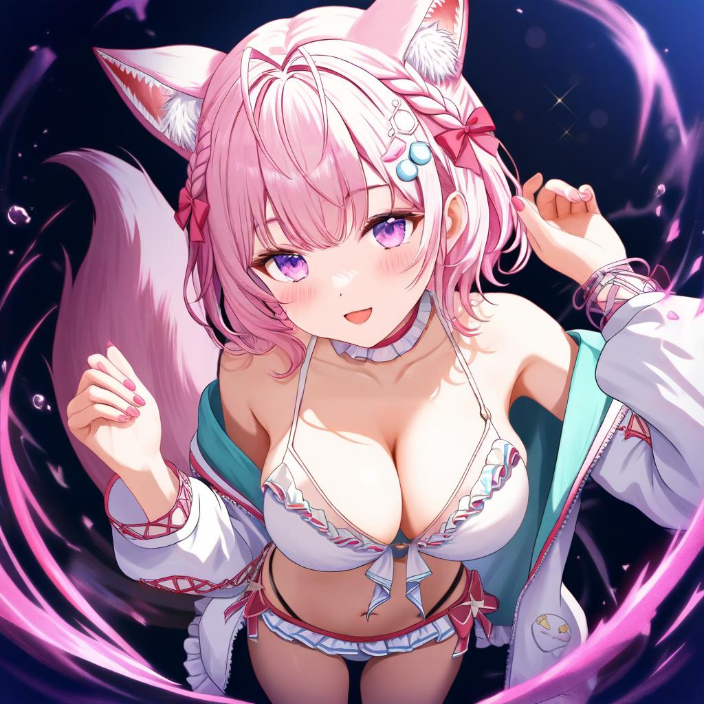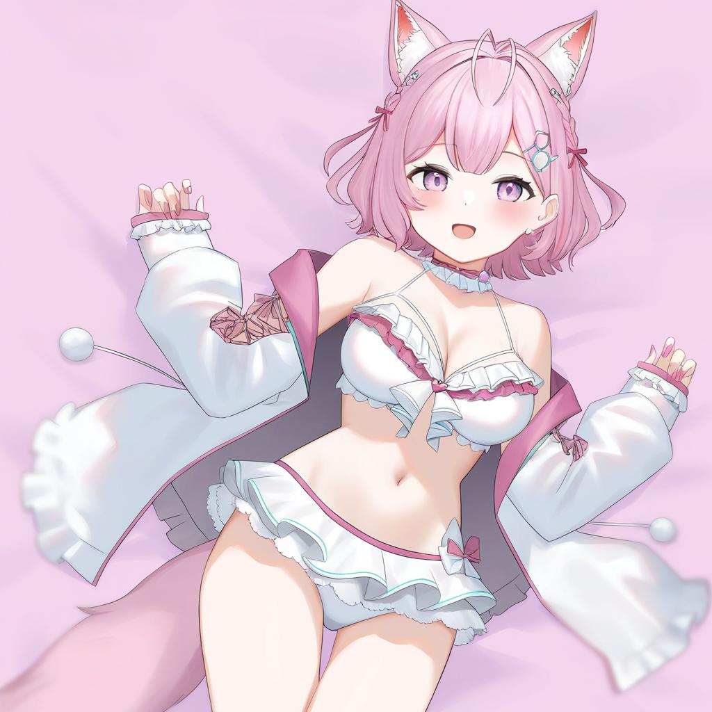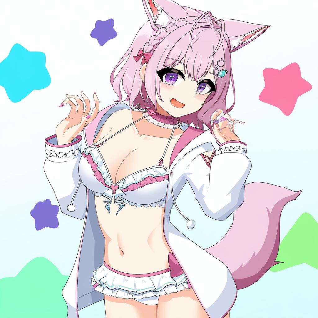 Hakui koyori (summer), hololive, 1girl, wolf girl, wolf ears, animal ear fluff, wolf tail, extra ears, fang, purple eyes, pink hair, antenna hair, medium hair, short hair, braid, hair ornament, hair ribbon, large breasts, cleavage, thighs, navel, collarbone, white bikini, frilled bikini, white hoodie, frilled choker, white choker, pink choker, bare shoulders, long sleeves, pink ribbon, two-tone choker, virtual youtuber, virtual youtuber, pink nails, fingernails, nail polish, stomach, by artist ichirugi, illustrious