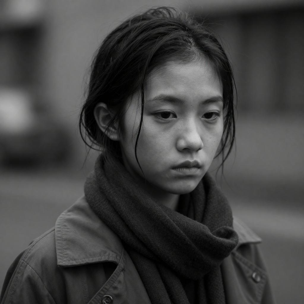 Black-and-white photograph of an Asian woman with short black hair, wearing a belted dress, sitting on a block, arms bound behind her back. She is in an outdoor, rustic setting with a large tree, old camera equipment, and tangled wires in the background. Her expression is calm and resigned.