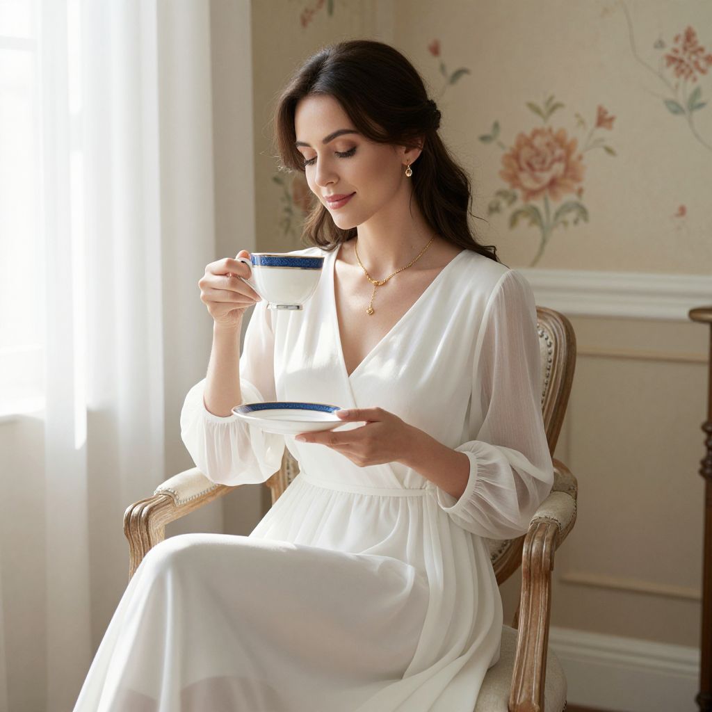Elegant woman seated in a wooden chair, wearing a delicate white dress with sheer sleeves and a gold necklace, gracefully holding a white teacup with blue accents on a matching saucer, set against a floral wallpaper backdrop with soft natural light streaming through sheer curtains.
