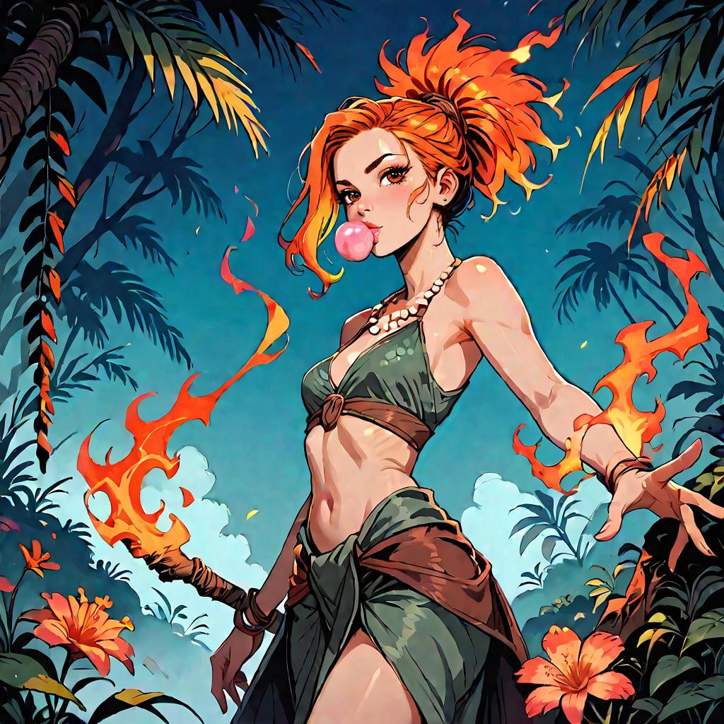 Score_9, score_8_up, score_7_up, a beautiful huntress with bubble gum in jungle, the girl with the pearl, vermeer, burning hair, glowing hair, short hair, high ponytail, small breasts, magic, looking at viewer, rating_safe
