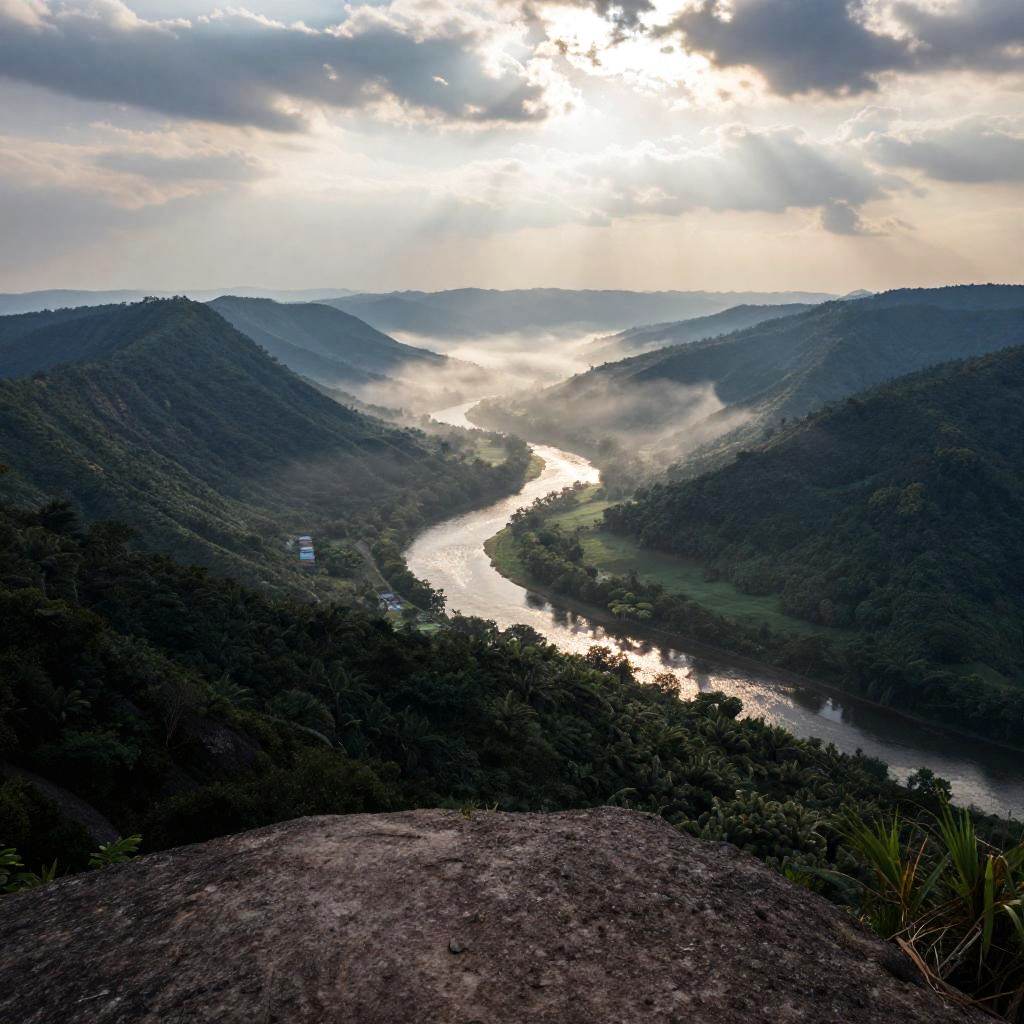 Looking down perspective from a mountain peak, overlooking a vast forest valley with winding rivers, early morning mist, soft sunlight filtering through clouds, detailed nature scene