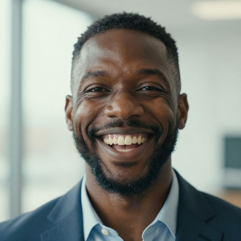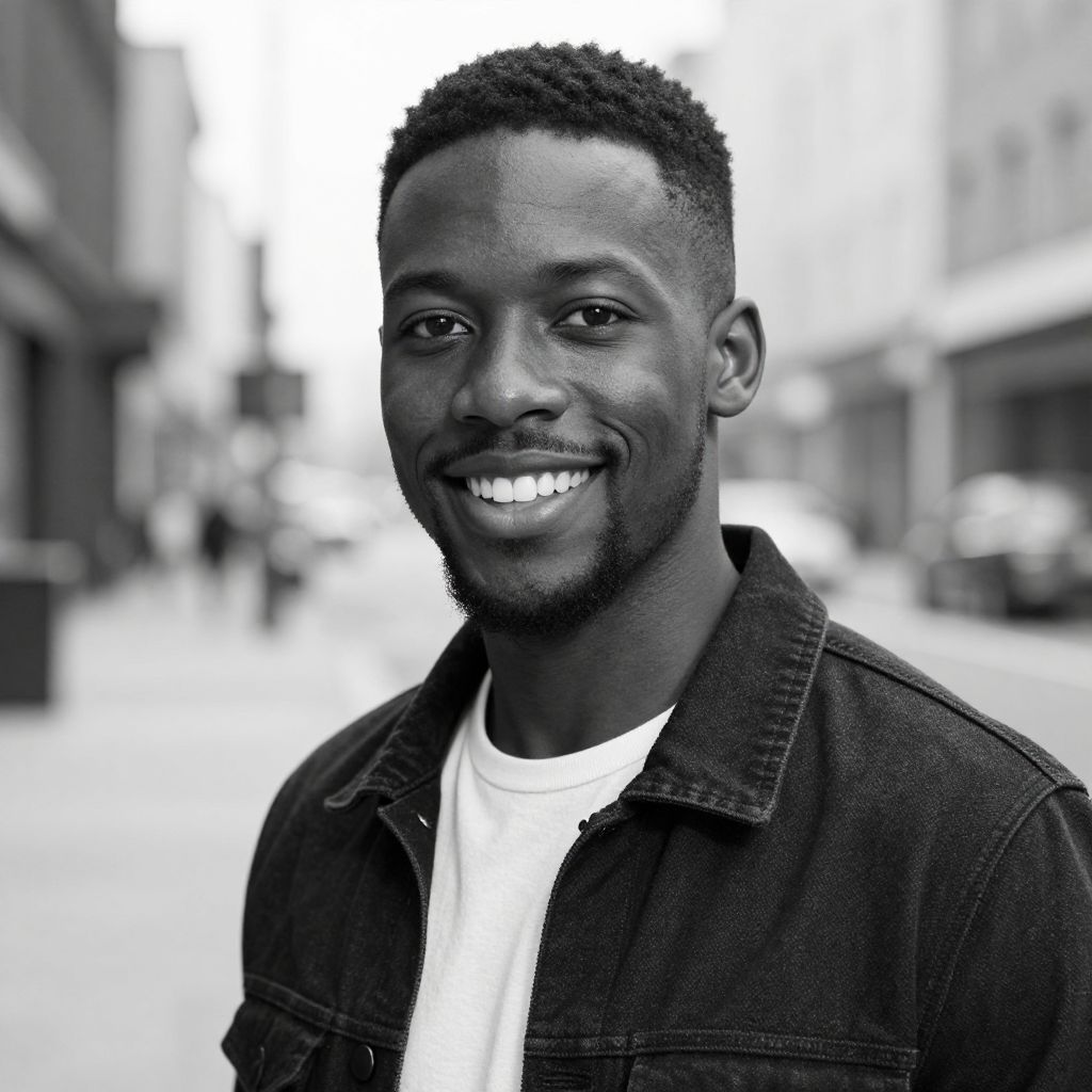 Photograph of a Black man with a dark complexion, short-cropped hair, and a trimmed beard, smiling broadly at the camera. He is wearing a dark navy blazer over a plain white t-shirt. The background is a slightly blurred urban street with buildings, parked cars, and a few pedestrians. The man stands in the center, with the street's yellow line visible in the foreground. The overall mood is professional yet approachable, with natural light illuminating the scene.