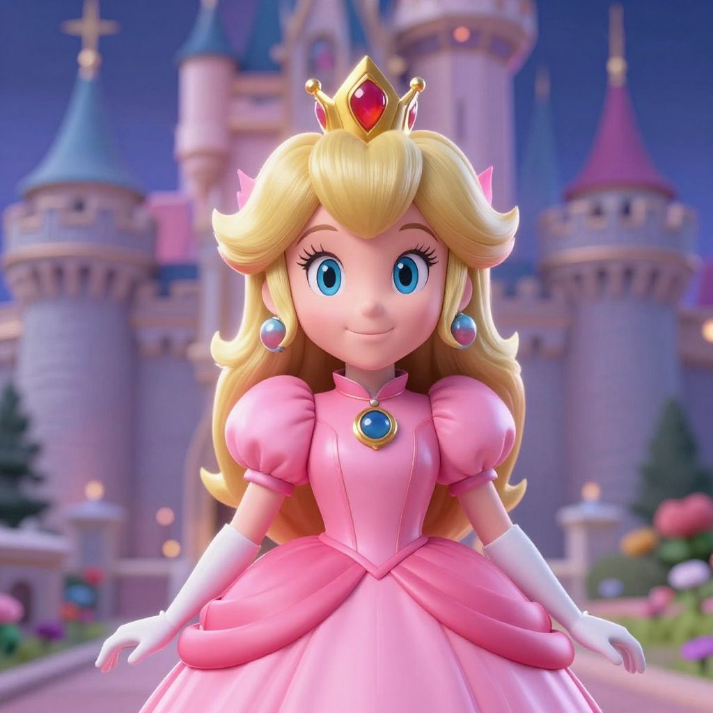 CGI image of Princess Peach from Mario series in a pink dress, crown, and blue earrings, smiling in front of a colorful castle at night.