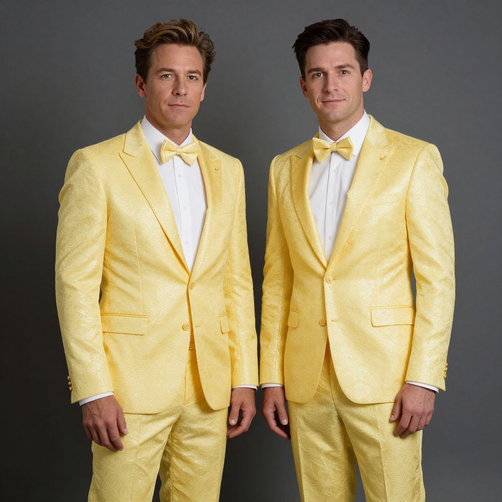 Photograph of two tall, handsome men in matching shiny yellow tuxedos with white shirts and bow ties, standing against a dark gray background.