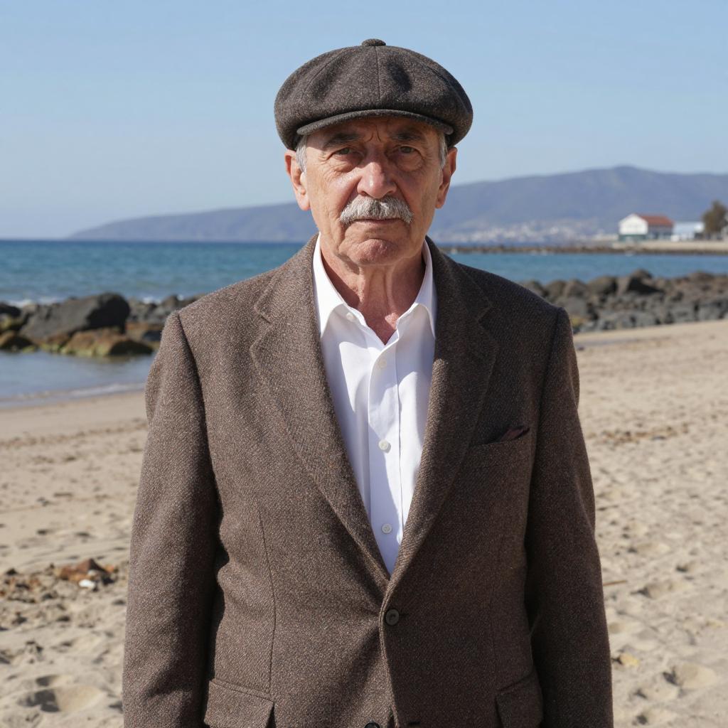 Old man with graying hair and a mustache, wearing a dark green military cap and jacket with a high collar. His expression is serious and slightly tense. Background is a blurred green forest. He is positioned slightly to the right, facing forward.