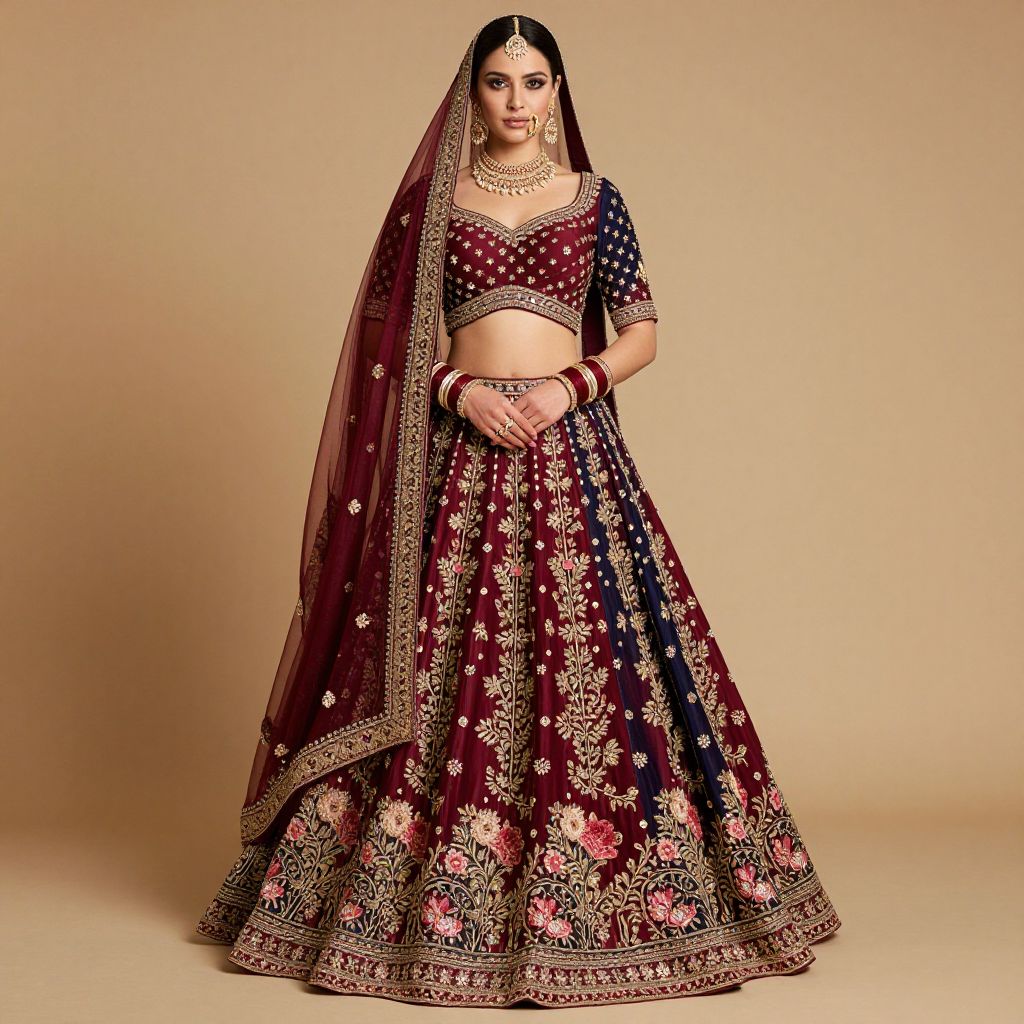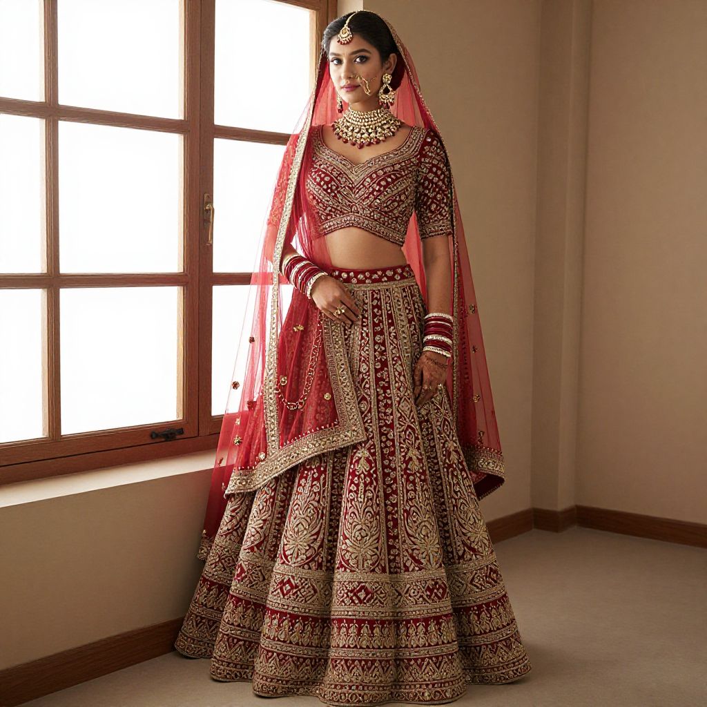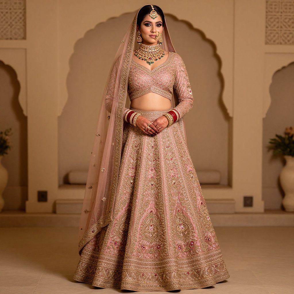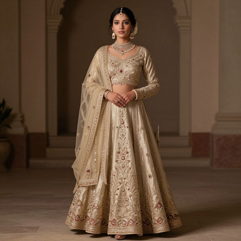 Photograph of a South Asian woman in an ornate, gold-embroidered lehenga and dupatta, standing in an elegant, beige,