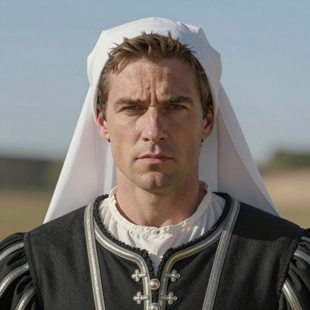 Headshot of a mature fair-skinned man with short brown hair wearing a medieval-style black dress with white trim and silver embroidery, paired with a white coif covering his head. The man has a serious expression with detailed facial features, set against a slightly blurred outdoor background with blue sky in bright daylight. The portrait focuses sharply on the face with realistic skin textures and subtle warm lighting.
