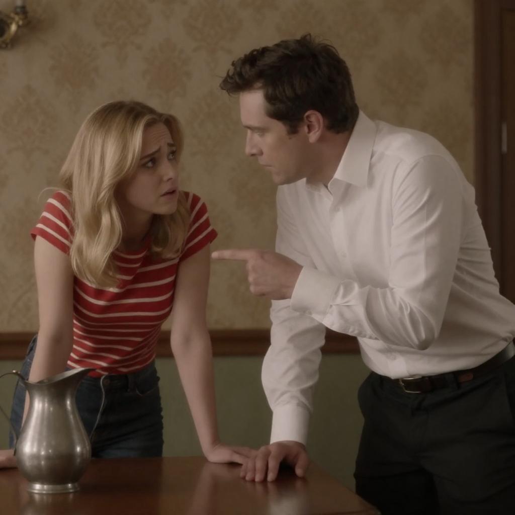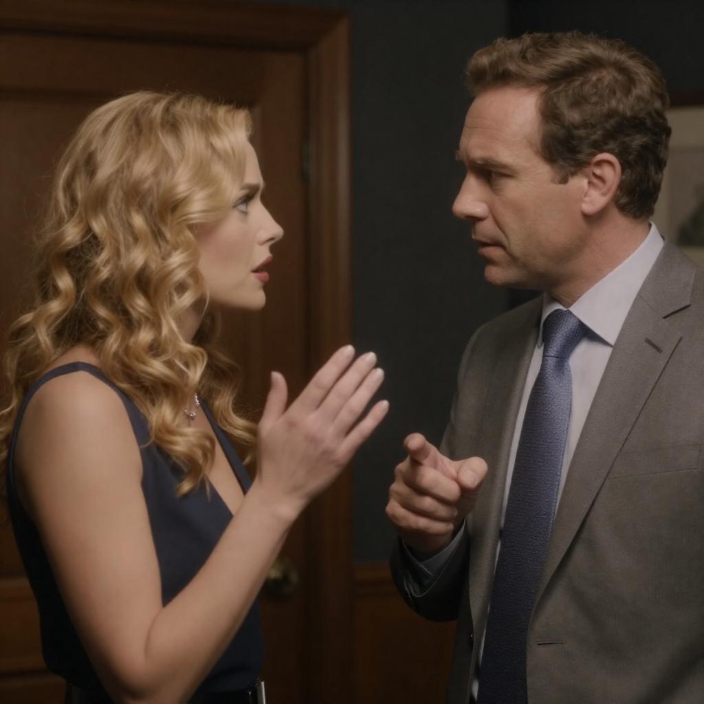 Photograph of two people in a close conversation. Blonde woman with curly hair, sleeveless top, intense expression, hand raised. Man with brown hair, gray suit, blue tie, serious expression, pointing with finger. Dimly lit indoor setting. Woman on left, man on right. Background includes wooden door and dark patterned wall.