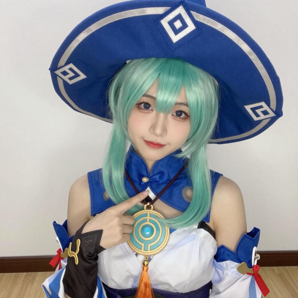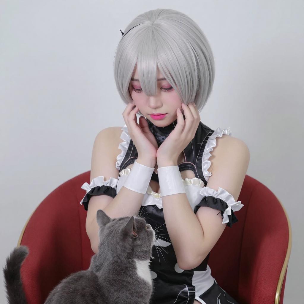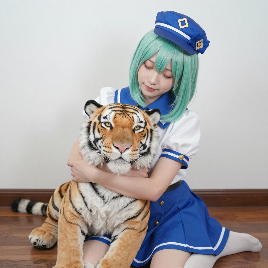 Photograph of a green-haired cosplayer in a blue and white outfit, holding a tabby cat. The cosplayer wears a blue hat with a white emblem and has fair skin, red lipstick, and closed eyes. The cat is looking up at her, with its front paws on her chest. The background is a plain white wall with a wooden floor.