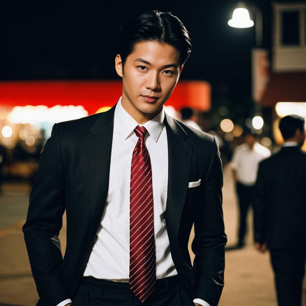 Group of young Asian men dressed in black formal suits and white shirts, wearing red and black bow ties. The main subject is centered, with black hair and a red bow tie, standing against a red curtain background. The setting appears to be a formal event or acquaintance party, with a focus on elegance and style.