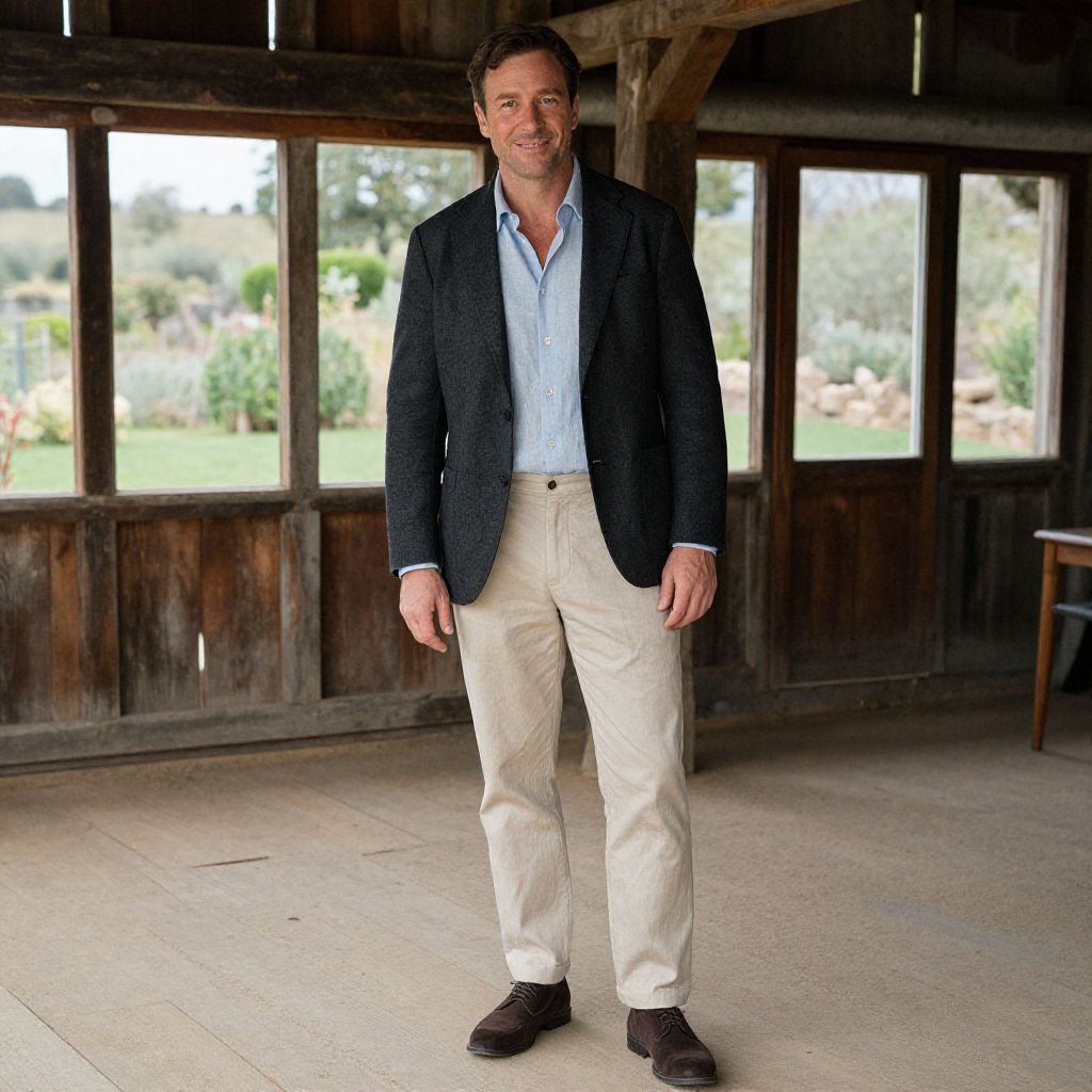 A man, charcoal blazer, beige chinos, pale blue linen shirt, dark brown suede shoes, smart-casual vibe, rustic barn, wooden beams, large windows overlooking a garden, oversaturated film, relaxed smile. Man has masculine face and piercing eyes