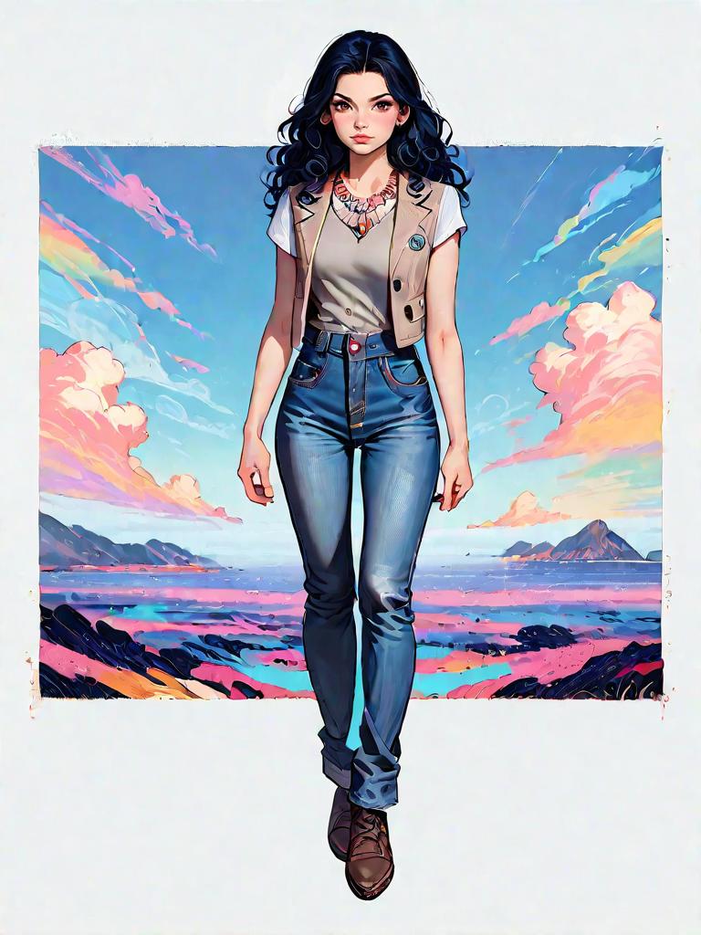 Digital artwork of a full-body shot of a woman with a realistic face, walking confidently in casual streetwear. She wears a white sleeveless halter top tucked into high-waisted distressed boyfriend jeans with large knee holes and frayed hems. The outfit is accessorized with a brown leather belt with a gold buckle and black open-toe wedge sandals. She has short dark hair and blue eyes. The background features vibrant coral formations in shades of orange, red, and blue, surrounding a calm body of water under a clear sky with scattered clouds and flying seagulls, creating a surreal, colorful atmosphere.