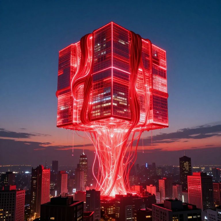 Photograph of a futuristic, glowing red skyscraper with neon lights, resembling a floating cube, towering over a dark city skyline at dusk.